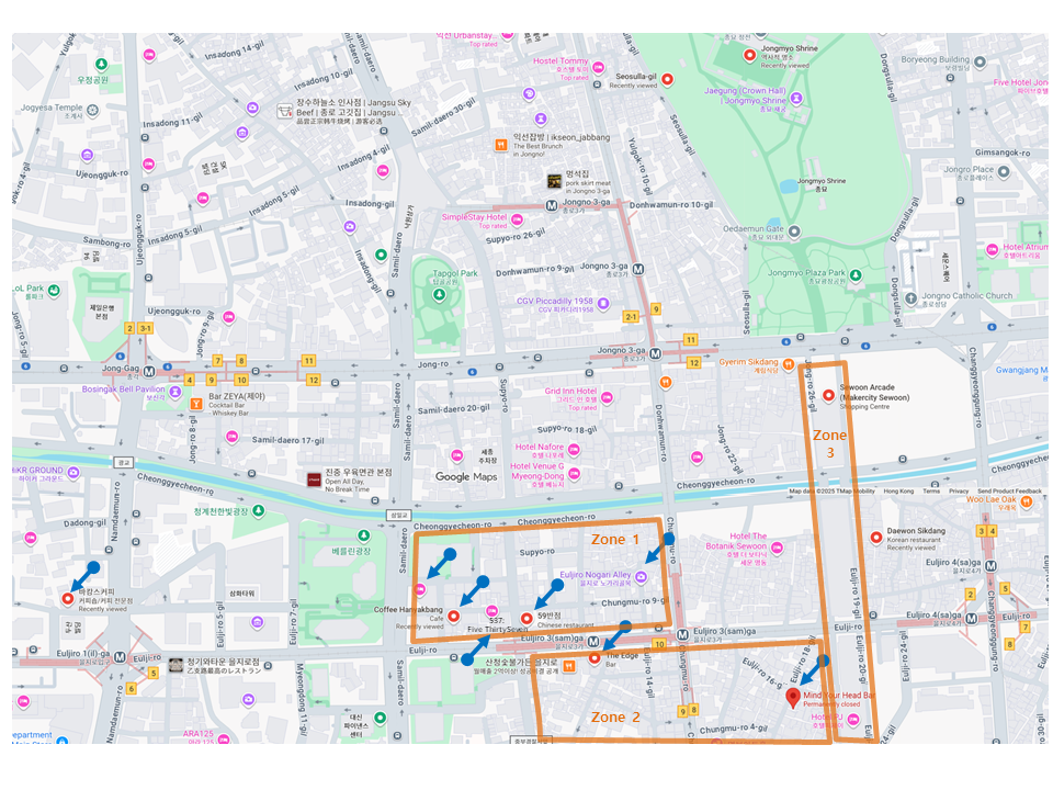 Zone 2: Various print shops, hip cafés, bars, Korean BBQ restaurants, etc., densely packed together